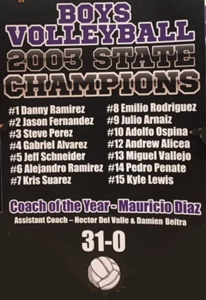 The Eagles finished 31-0 and won the state championship in the first year the FHSAA had a state tournament. They entered the state tournament 28-0 and faced Coral Springs in the quarterfinal match. Southwest had little trouble dispatching the Colts, 15-3, 15-8. That set up a semifinal contest against neighborhood rival Coral Park. The Rams were overpowered, 15-6, 15-11. Later the same day, it was Southwest vs. Orlando Cypress Creek for the state title. The Bears were no match for the Eagles either, falling 15-3, 15-12, in the championship match. That capped a remarkable season in which the team lost only three sets. The Eagles were not only state champions, but they achieved the best record of any high school team in any sport in Florida for the 2002-03 school year. It was the first state championship for a Southwest team since the boys bowling team took states in 1978. Bowling was not a sanctioned FHSAA sport at the time, so volleyball won our school's first FHSAA state title since the boys track team won 32 years earlier. This team set the standard for Eagles volleyball. The program has since won two more state championships under coach Mauricio Diaz and have made the title match on five other occasions.