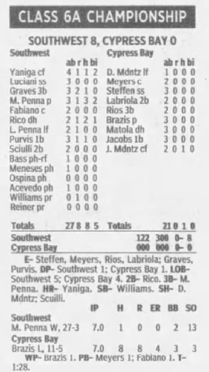 The 2004 softball team is the only girls team to ever win a state championship at Southwest. The Eagles finished 28-3 for their fourth straight 20-win season in Ritz Diaz' final season as head coach. During the regular season, they won the Kissimmee Klassic and Slamfest but, to make its first Final Four appearance since 1991, Southwest needed to defeat rival Palmetto, a team that had beaten the Eagles three times in a row. The Regional championship game against the Panthers took 11 innings, but Alysse Rico's two-run double broke the tie and sent Southwest to the state tournament in Tampa. The Eagles beat Valrico Bloomingdale in the state semis, 1-0. The game went extra innings but, in the top of the ninth, Leanne Penna singled home Monique Williams with the only run of the contest. In the bottom of the inning, Missy Penna retired the side in order to end it. The championship game was less stressful as the Eagles won, 8-0, over Cypress Bay on a Missy Penna 1-hit, 13-strikeout performance. The Herald's All-Dade team had five Southwest players on the first team: Missy Penna, Jackie Yaniga, Rico, Falyn Fabiano and Courtney Graves. Noemi Luciani and Jessica Sciulli made second team, Amanda Purvis won third team honors while Leanne Penna and Melissa Bass were honorable mention. Other team members were Williams, Sandy Acevedo, Melissa Reiner, Stephany Ospina, Ali Meneses and Nicole Menendez. The assistant coaches were Iris Gonzalez and Maria Alvarez and Michelle Parks.